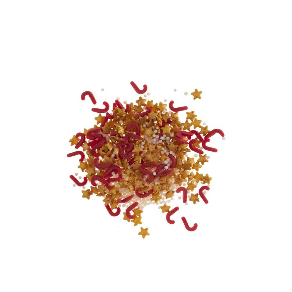 Dekora cukrové hvězdičky a hůlky ve zlaté a červené barvě dodají vašim dezertům sváteční lesk a eleganci.