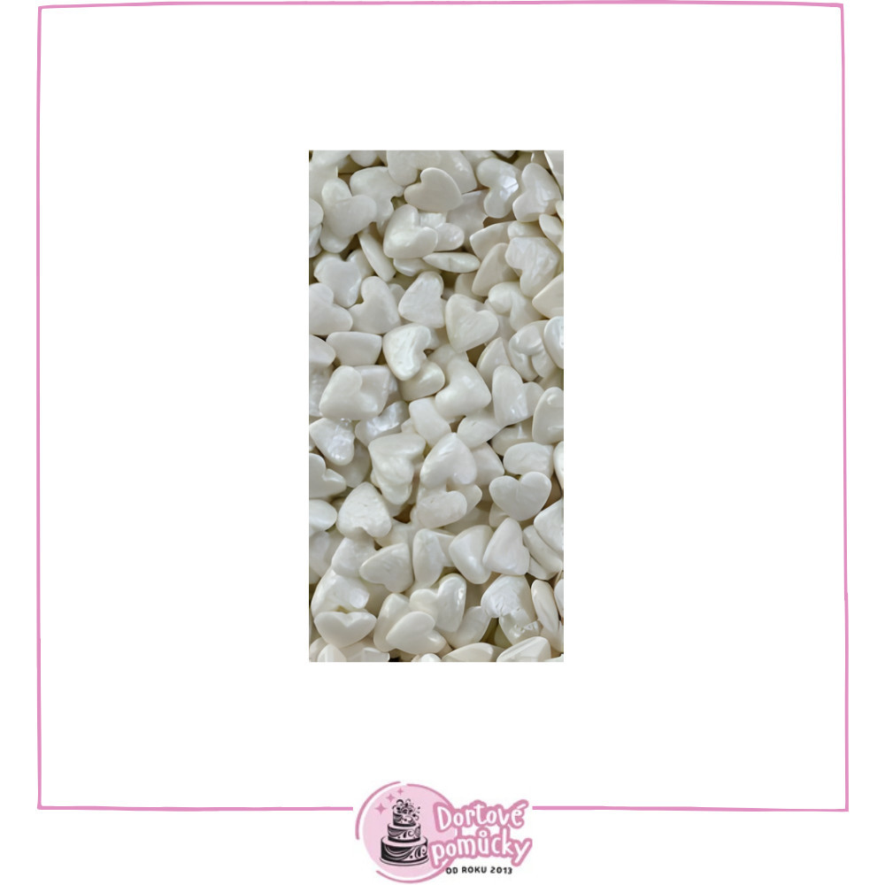 Tyto jedlé cukrové srdíčka perleťové jsou praktickým a efektním doplňkem pro dorty, zákusky, pralinky i drobné dezerty.