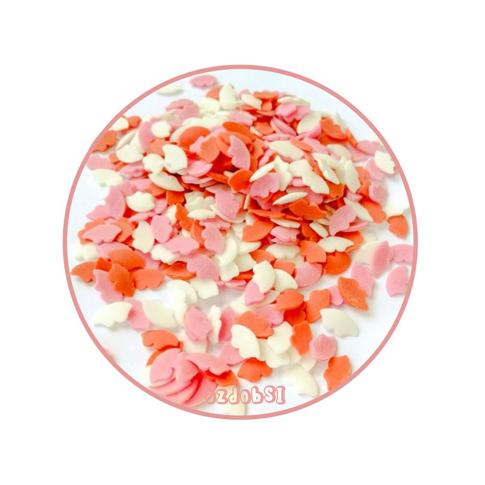 Cukrové pusinky ve třech barvách: červené, růžové a bílé.