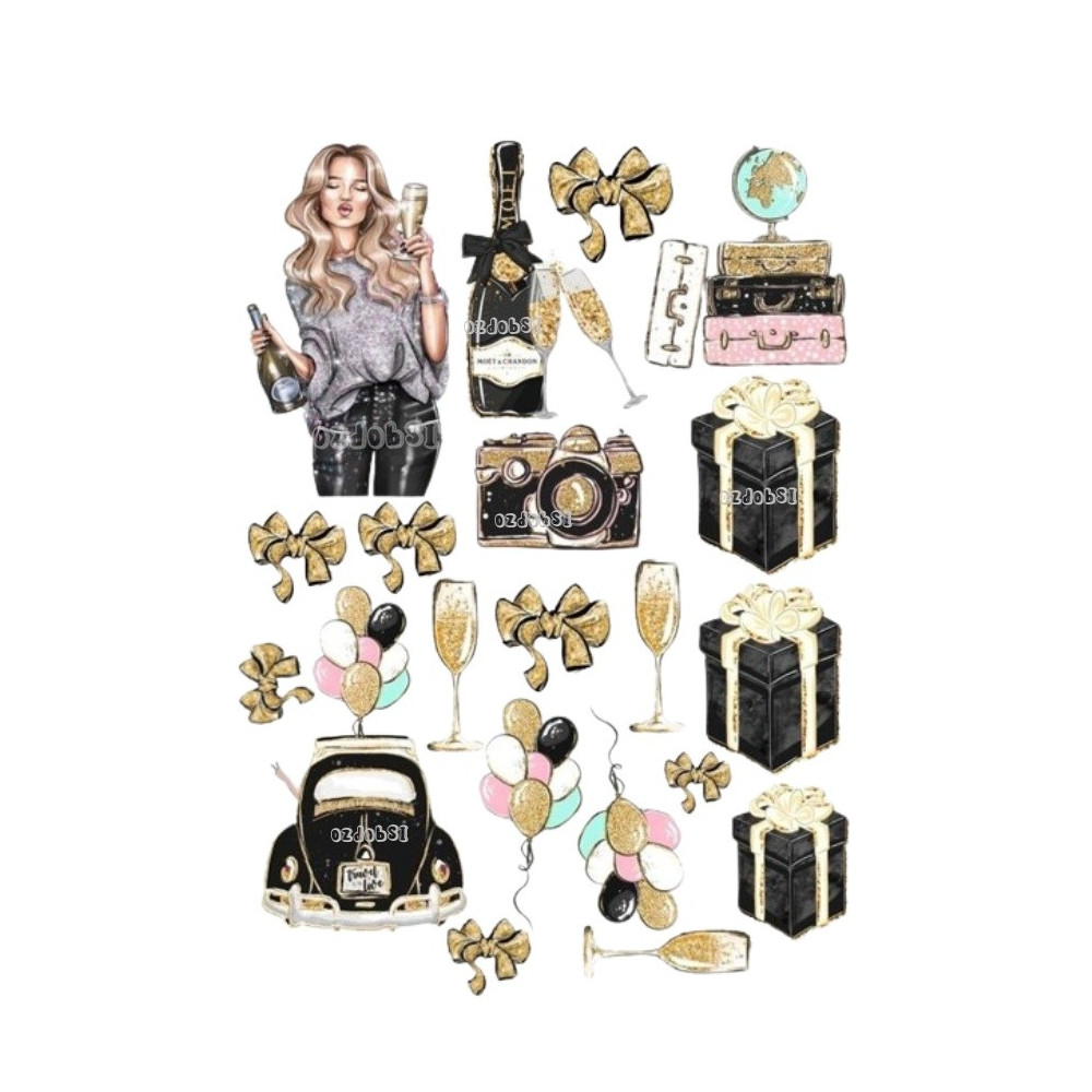 Obsahuje jedlý papír s motivem ženských motivů ve zlaté barvě.