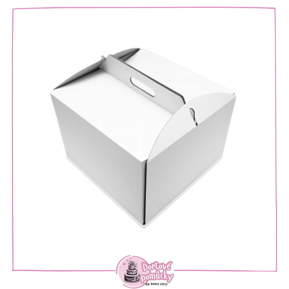Pevná papírová krabice na patrový dort – rozměry 26 × 26 × 25 cm.