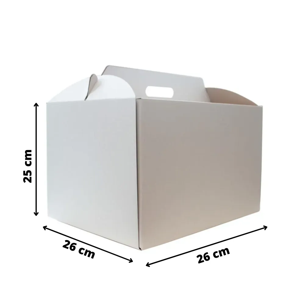 Pevná papírová krabice na vysoké a patrové dorty je navržen pro bezpečné a elegantní doručení – rozměry 26 × 26 × 25 cm poskytují dostatek prostoru i pro bohatě zdobené dorty.