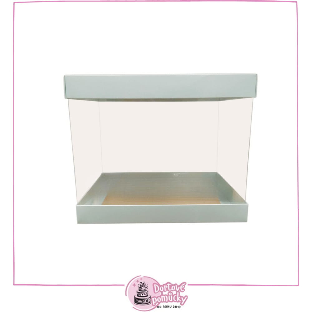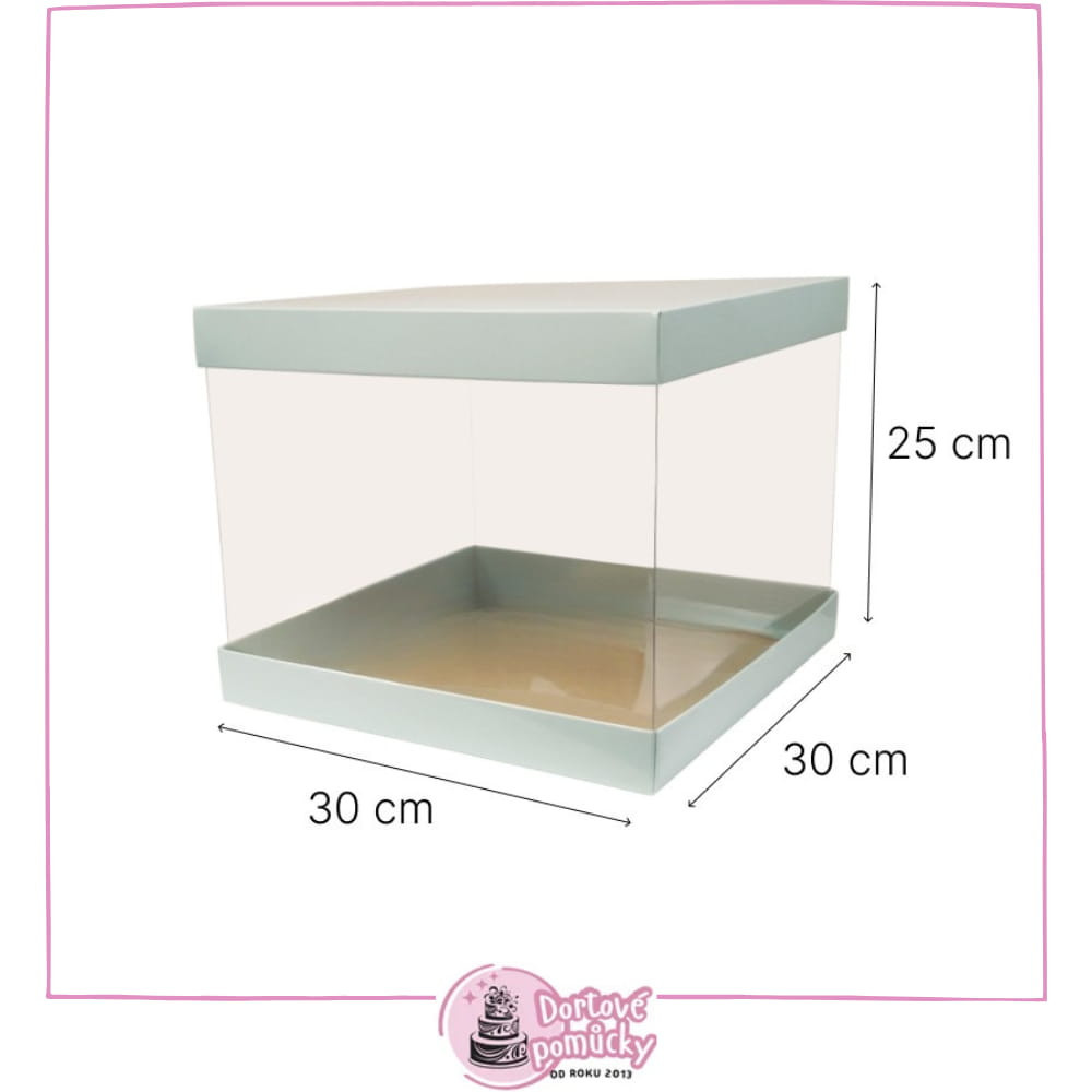Elegantní krabice na dort 30×30×25 cm – kombinace pevného kartonu a průhledného plastu.