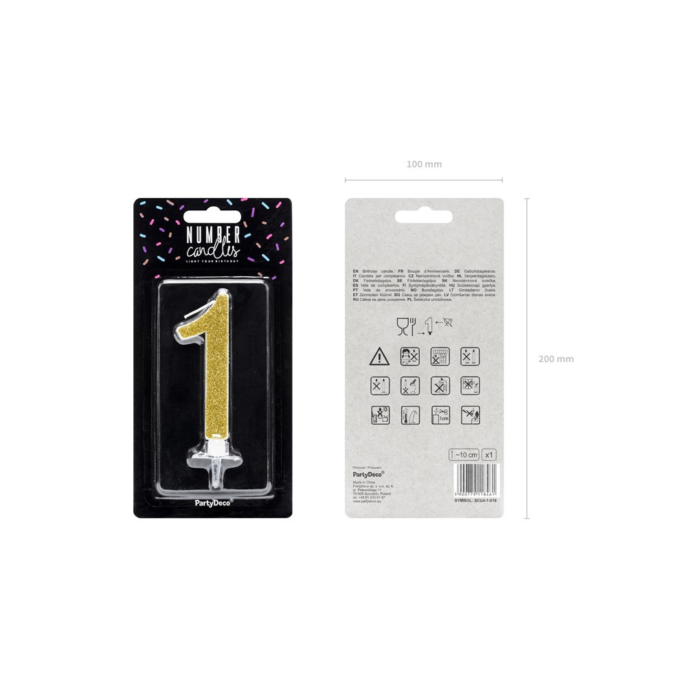 Velmi elegantní zlatá svíčka ve tvaru čísla 1, nesmí chybět na žádném narozeninovém dortu.