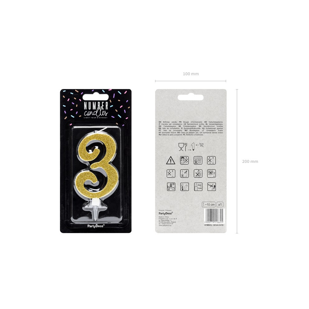 Velmi elegantní zlatá svíčka ve tvaru čísla 3, nesmí chybět na žádném narozeninovém dortu.