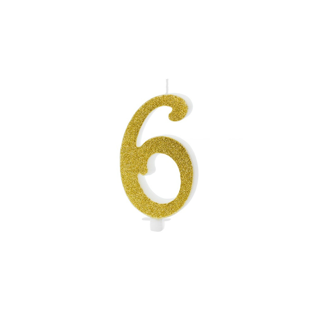 Velmi elegantní zlatá svíčka ve tvaru čísla 6, nesmí chybět na žádném narozeninovém dortu.