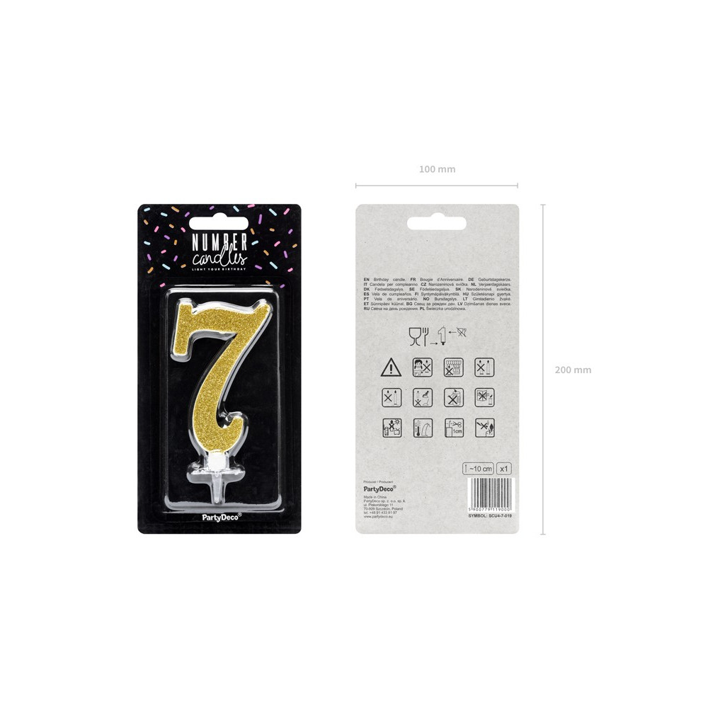 Velmi elegantní zlatá svíčka ve tvaru čísla 7, nesmí chybět na žádném narozeninovém dortu.