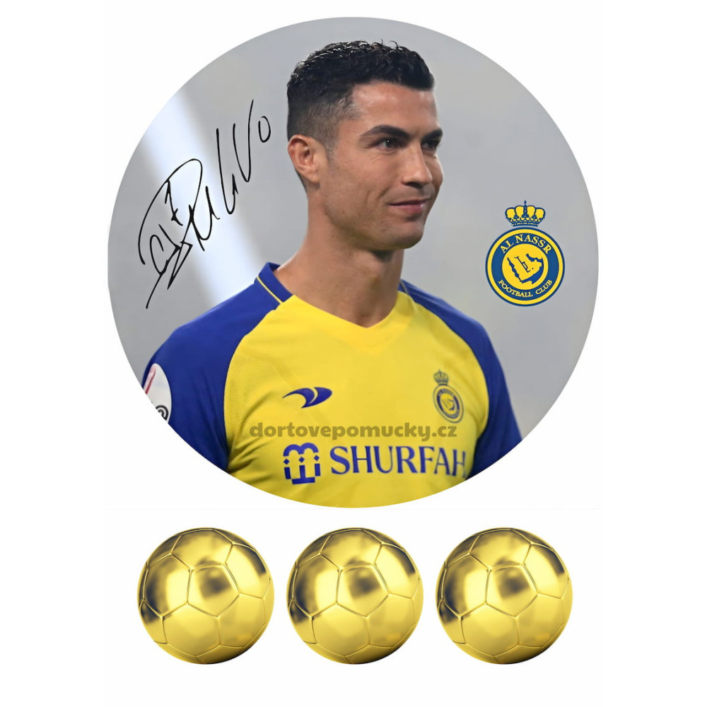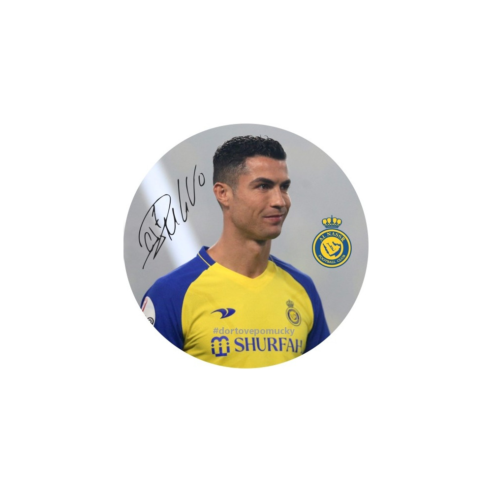 Jedlý obrázek Ronalda v barvách nového klubu Al Nassr s logem a podpisem.