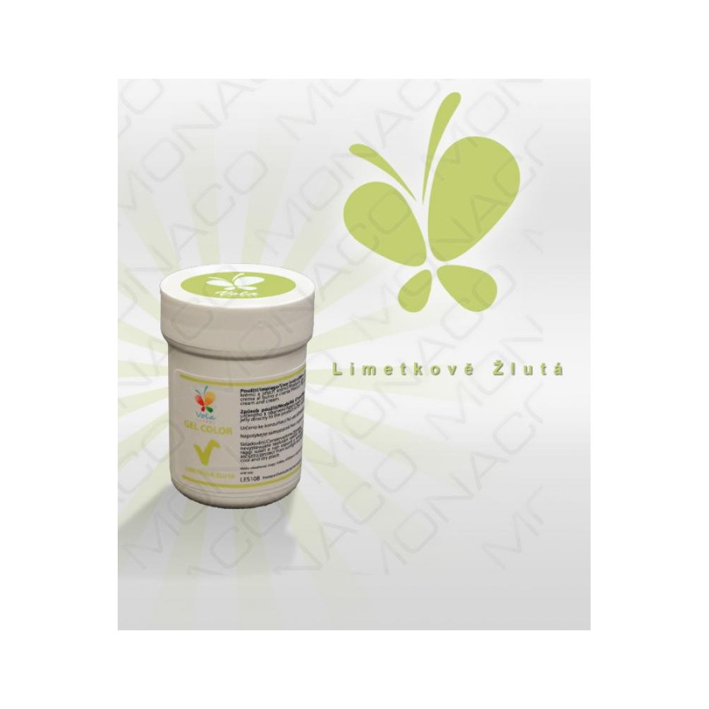 Potravinářská limetková barva ve formě gelu.Vhodná k barvení máslových krémů, bílkových polev, těst a modelovacích hmot. Barvy jsou vysoce koncentrované, doporučujeme pro malování potahovacích hmot přidat do barvy čistý alkohol. Pokud chceme barvu světlejší přidáme více alkoholu, nebo pro lepší krytí nakapeme pár kapek běloby.