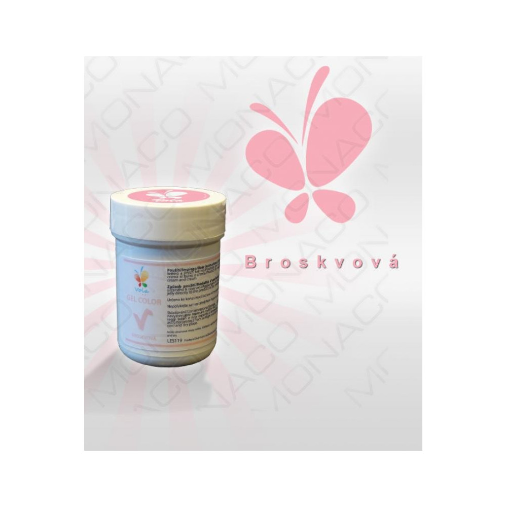 Potravinářská broskvová barva ve formě gelu.Vhodná k barvení máslových krémů, bílkových polev, těst a modelovacích hmot. Barvy jsou vysoce koncentrované, doporučujeme pro malování potahovacích hmot přidat do barvy čistý alkohol. Pokud chceme barvu světlejší přidáme více alkoholu, nebo pro lepší krytí nakapeme pár kapek běloby.