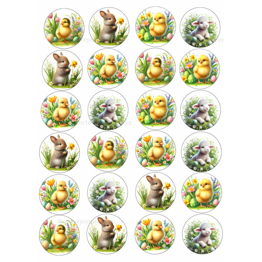 Roztomilé velikonoční motivy se zvířátky a jarní přírodou jsou krásnou dekorací pro velikonoční dorty a dezerty. Na obrázcích najdete kuřátka, zajíčka, jehňátko, jarní květiny a barevná velikonoční vajíčka.