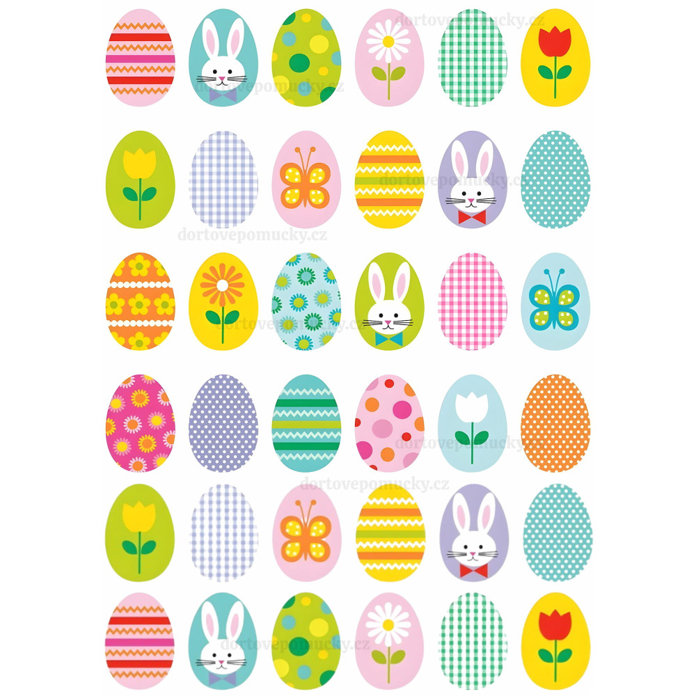 Veselé velikonoční motivy s barevnými vajíčky, zajíčky, květinami a motýlky vytvoří hravou jarní dekoraci pro dorty a další sladké dezerty.