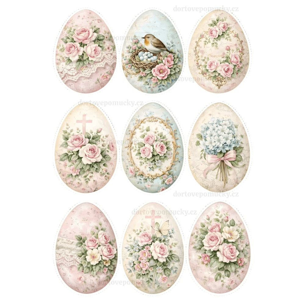 Něžné velikonoční motivy v romantickém vintage stylu zdobí růže, jarní květiny, ptáček v hnízdě s vajíčky a jemné dekorativní rámečky. Obrázky působí elegantně a hodí se pro slavnostní velikonoční dezerty.