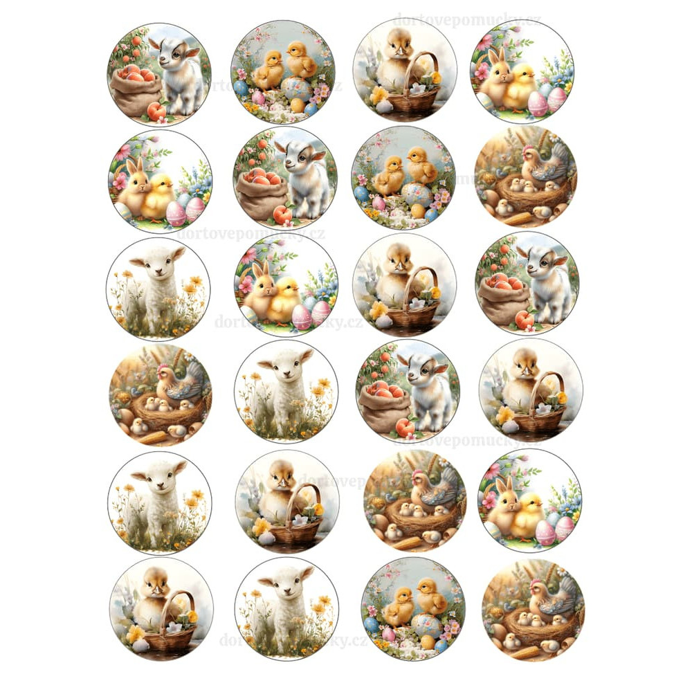 Roztomilé velikonoční motivy se zvířátky přinesou na vaše dezerty pravou jarní atmosféru. Na obrázcích najdete kuřátka, zajíčky, jehňátka i slepičku s vajíčky v jemných pastelových barvách.