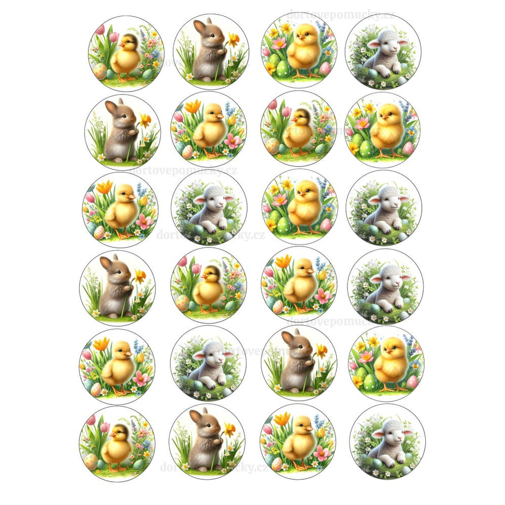Kulaté velikonoční motivy se zajíčkem, kuřátkem a jehňátkem přinesou na vaše dezerty jarní pohodu. Pastelové barvy, květiny a vajíčka udělají z obyčejného dezertu sladkou velikonoční parádu.