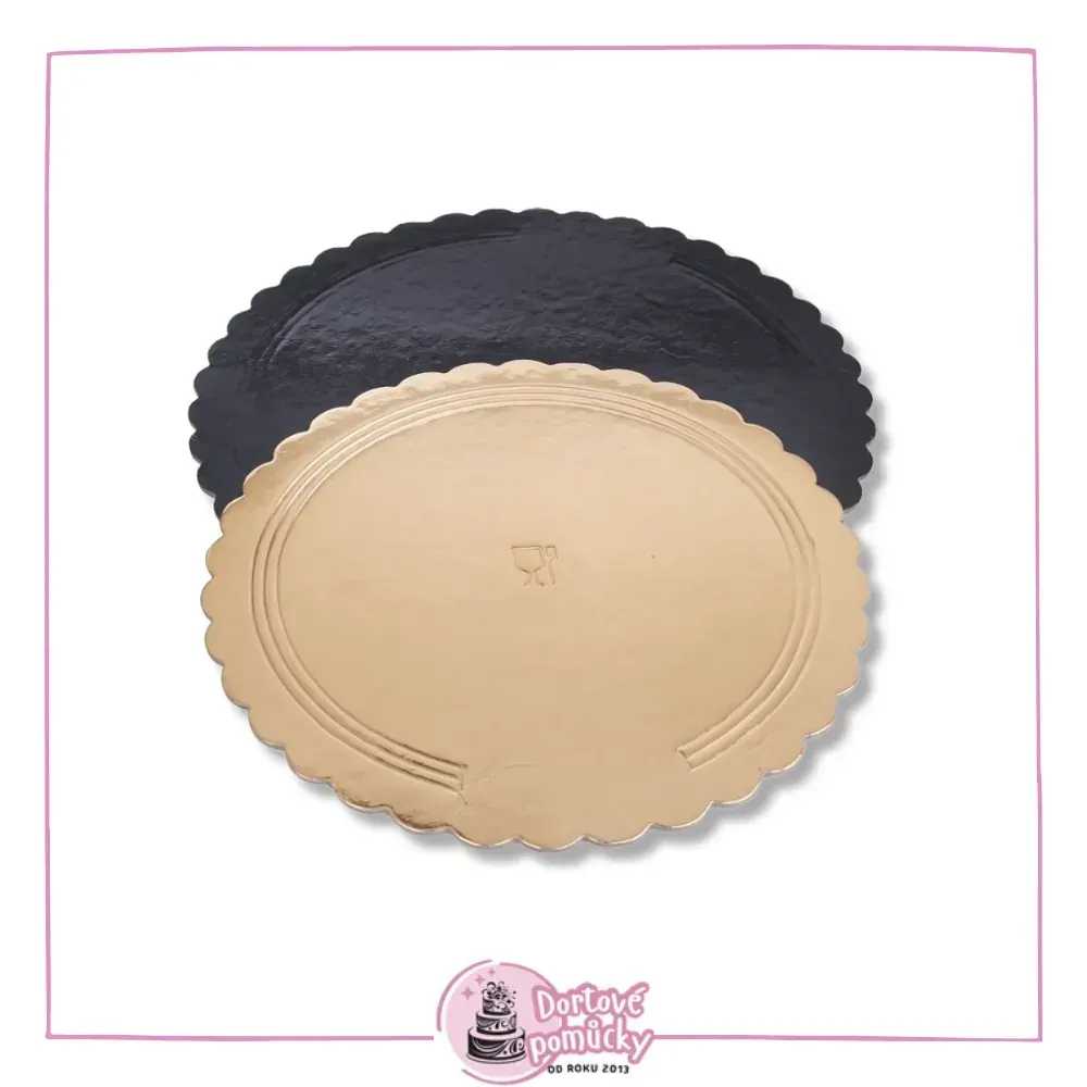 Velmi pevná lepenková podložka s ozdobným okrajem, potažená zlatou fólií odolnou proti vlhku a mastnotě.