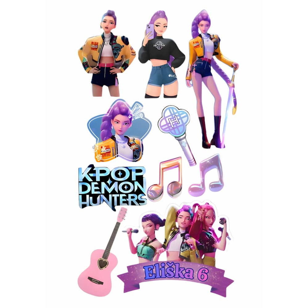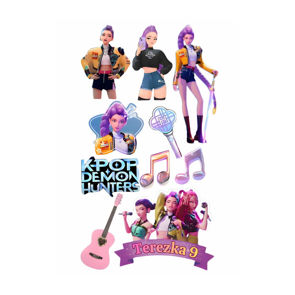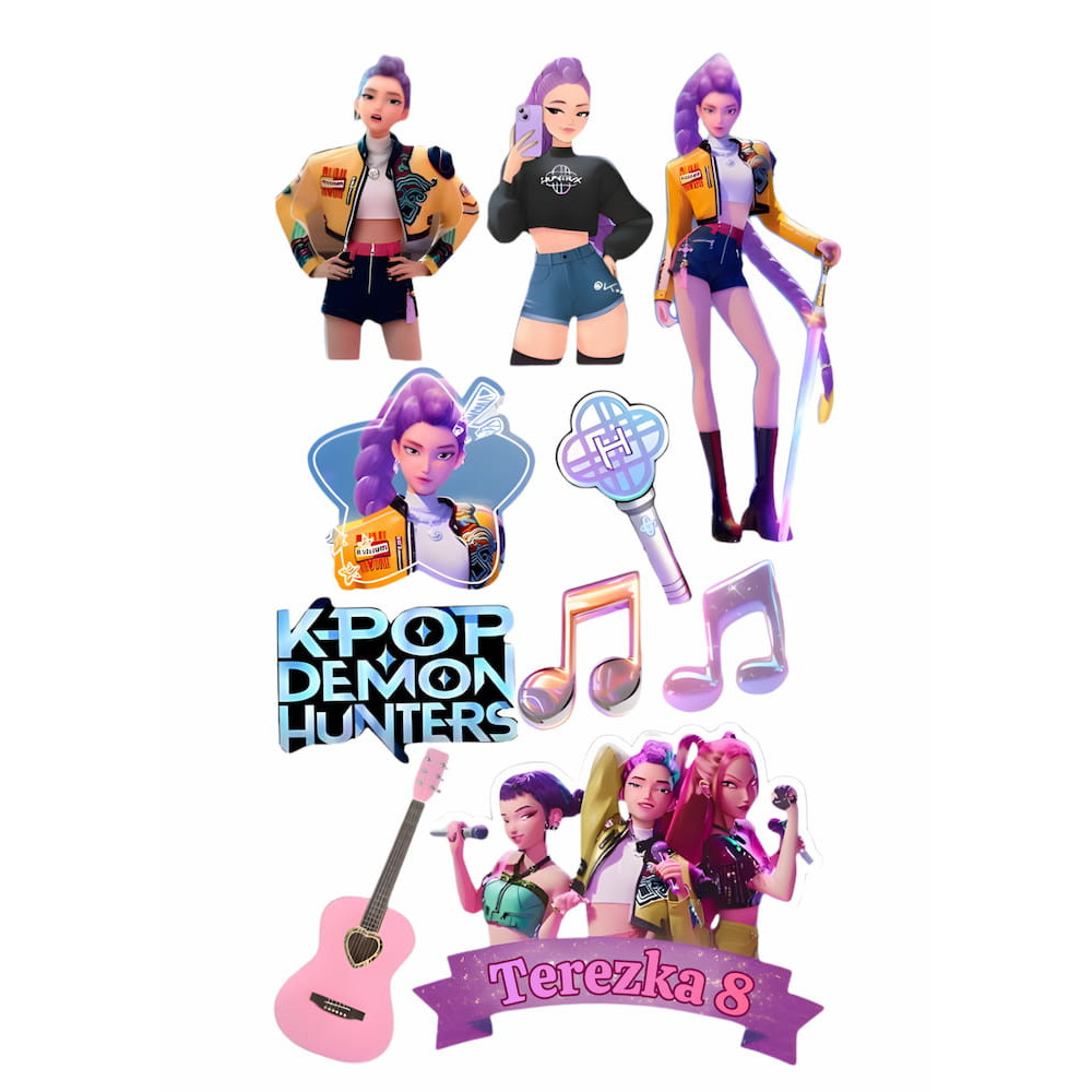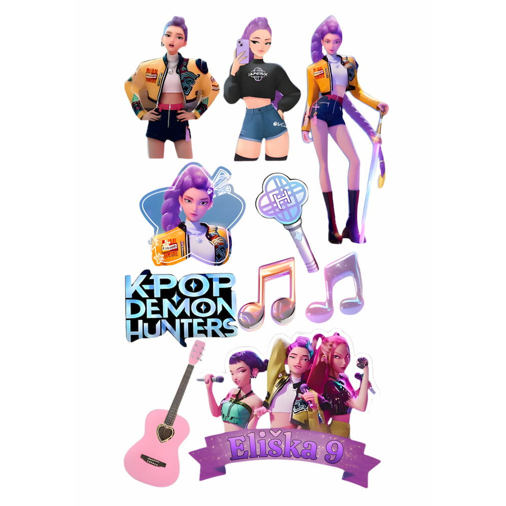 Tento aršík přináší hrdinky Demon Hunters, hudební symboly, mikrofony, kytaru i poutavé barevné doplňky – ideální pro K-POP dorty a tematické oslavy.