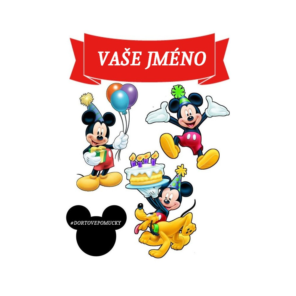 Mickey Mouse na pěti tématických obrázcích. Do obrázku se stuhou jde napsat jméno. Obrázky...