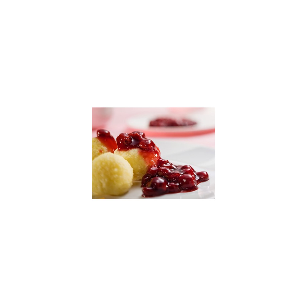 Složení: višně (70%), glukózový sirup, cukr, voda, modifikovaný škrob E1442, konzervant E202, regulátor kyselosti E330, zahušťovadlo E418, aroma.