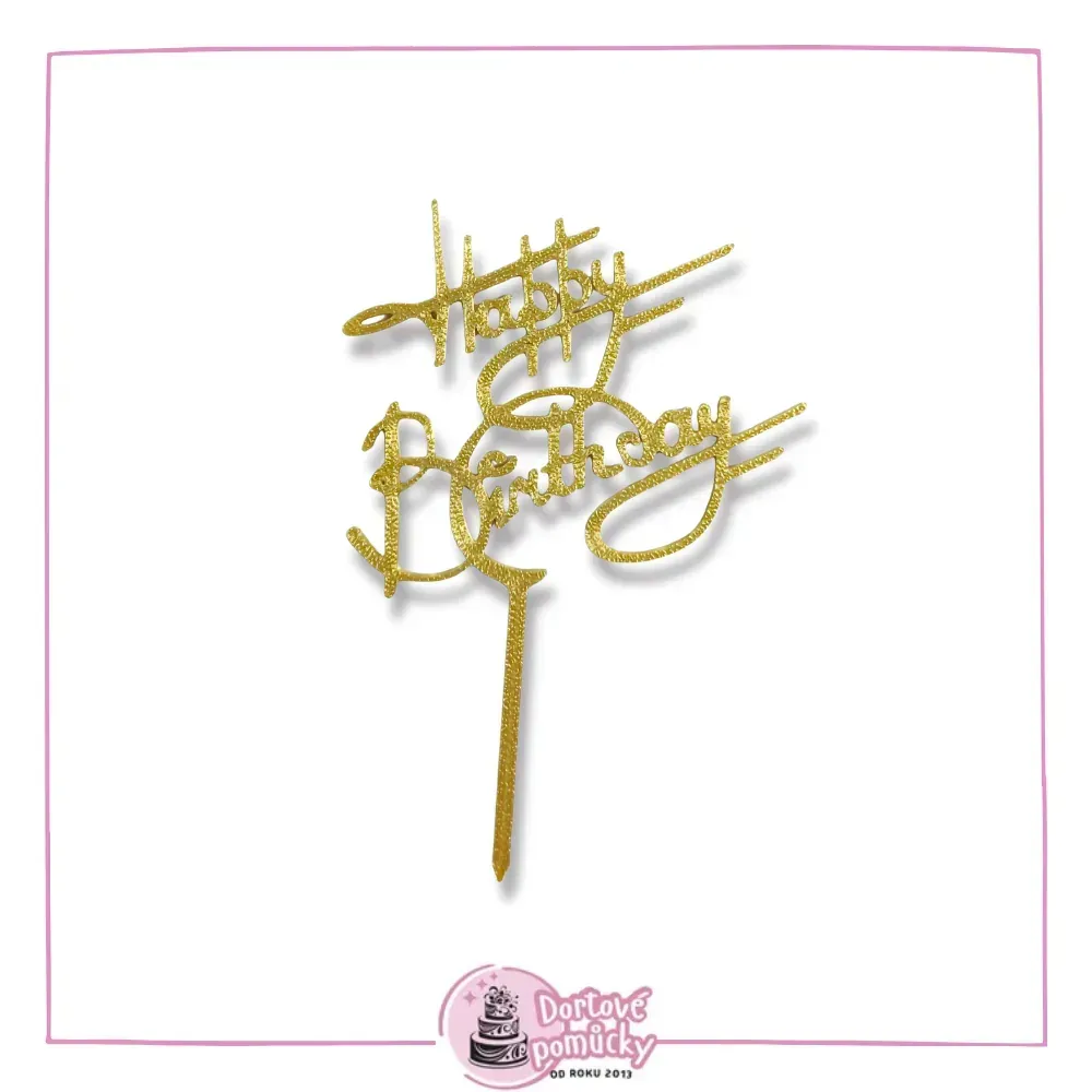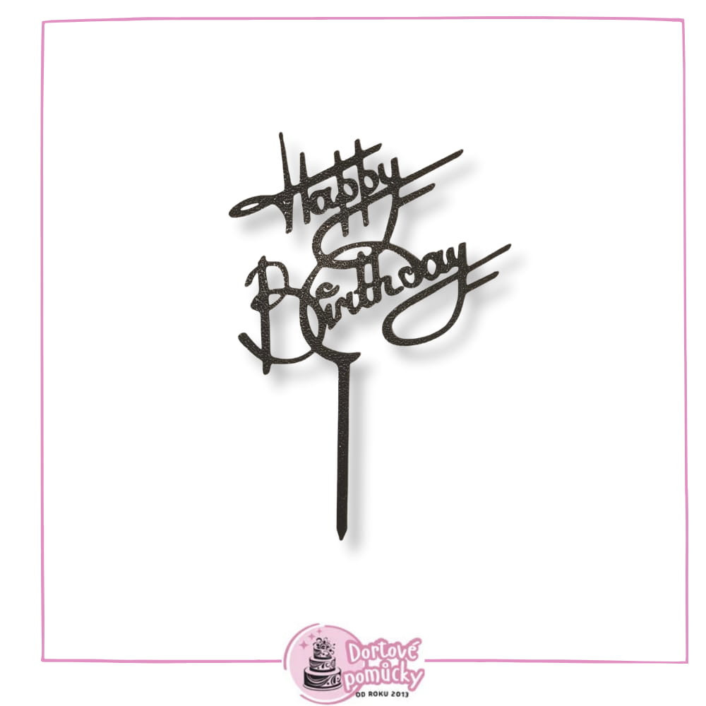 Dortový zápich "Happy Birthday" s krásně zdobeným písmem.