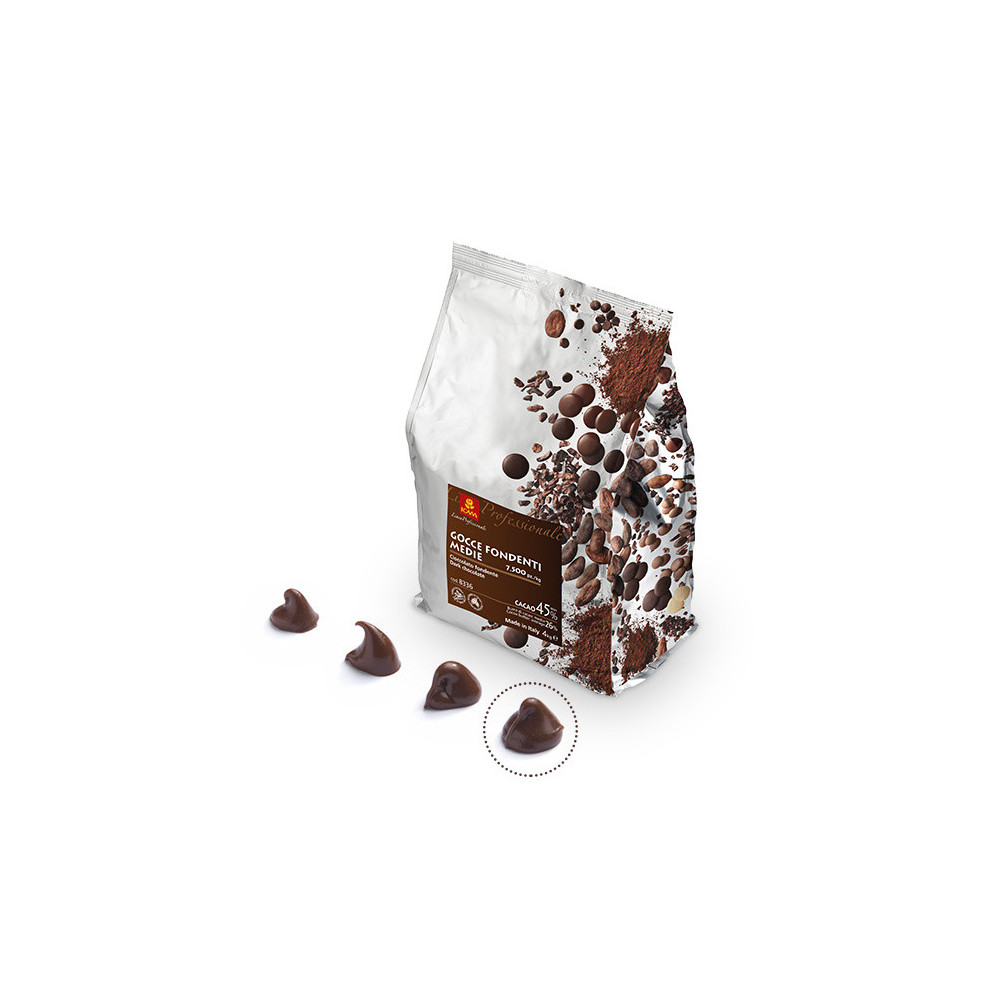 Tato tmavá italská čokoláda s obsahem 45 % kakaa je speciálně navržena tak, aby si v troubě zachovala svůj tvar a vytvořila v dezertech dokonalé čokoládové kousky.