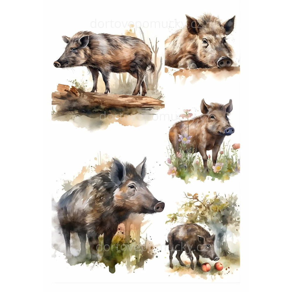 Jedlý papír nebo fondánový list s mysliveckým motivem divokého prasete nabízí sadu ilustrací zachycujících divočáka v různých pozicích a přírodních scenériích. Motiv je zpracován v akvarelovém stylu, působí přirozeně, dekorativně a bez agresivních prvků.
