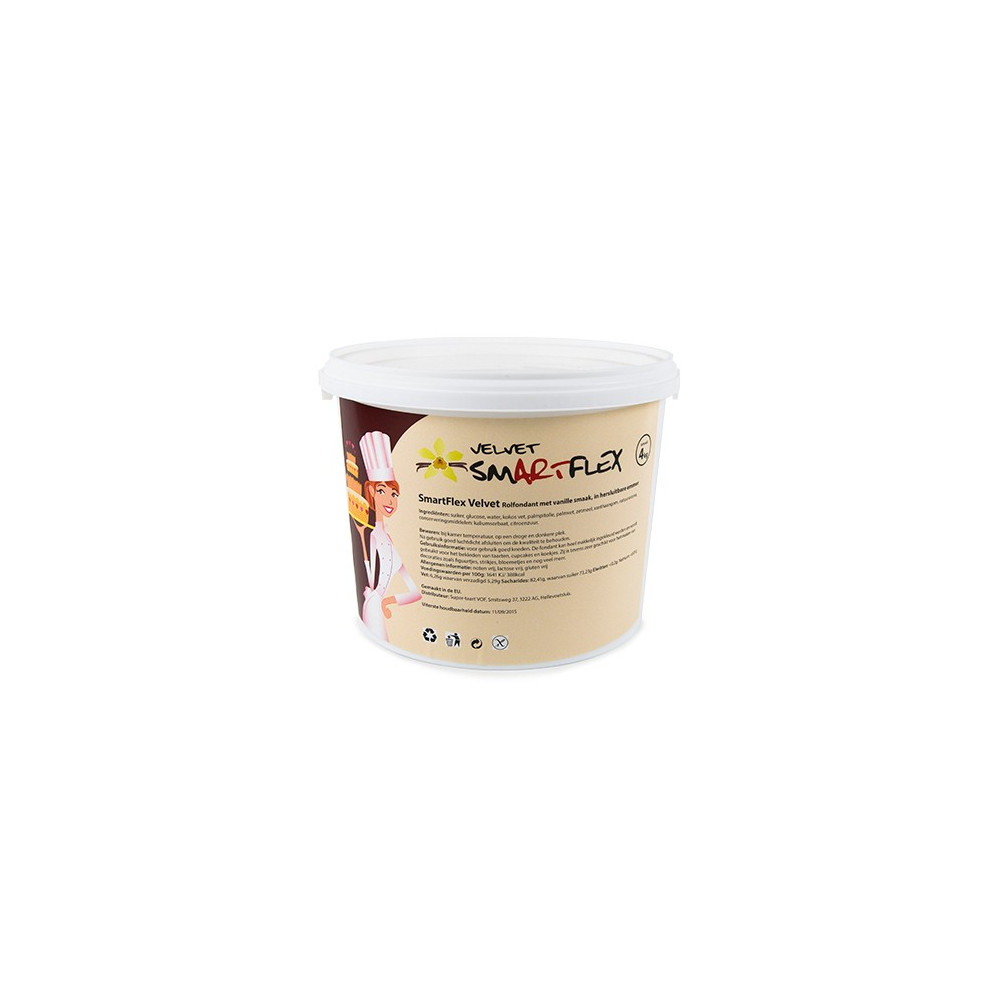 SmartFlex Velvet – vanilka je extra pružná potahovací a modelovací hmota s jemnou mandlovou chutí, která vyniká svou elasticitou a snadnou manipulací. Nelepí se, rychle drží tvar a nesesedá, což ji činí ideální pro potahování dortů a tvorbu dekorací všech velikostí.