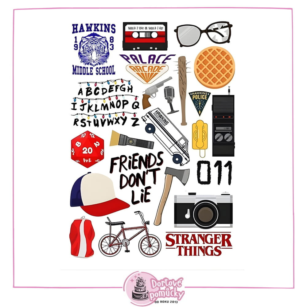 Motivy jako kola, kazeta, Eleven, světýlka či logo seriálu dodají dortu nezaměnitelný styl.