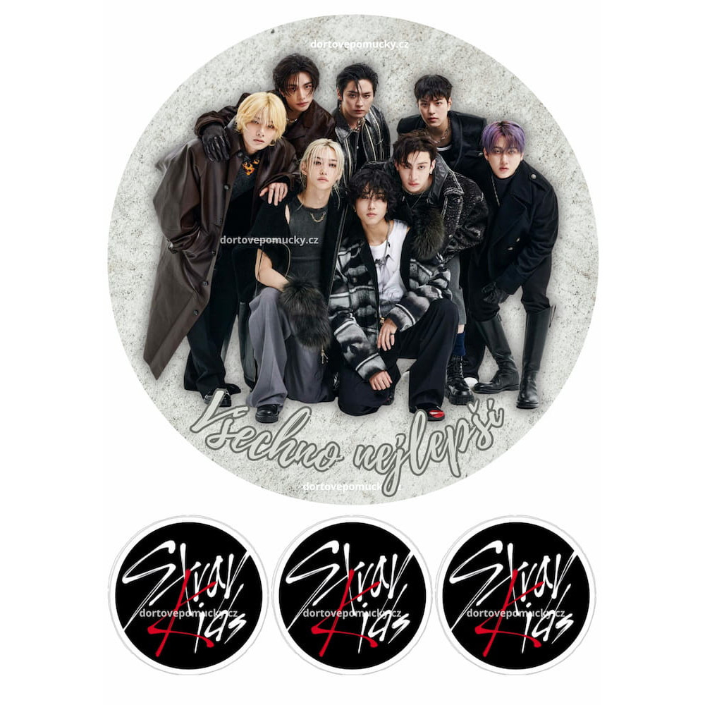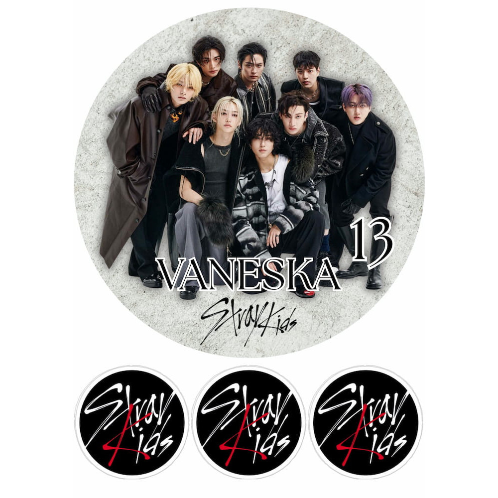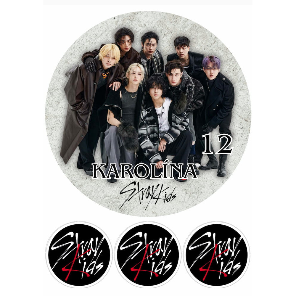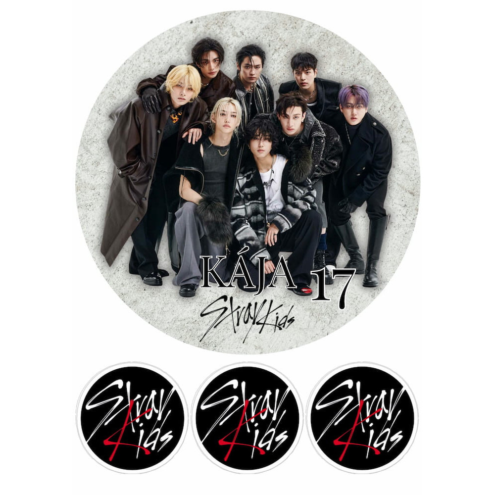 Tento jedlý papír přináší elegantní a luxusní zpracování motivu Stray Kids. Hlavní dominantou je velký kulatý obrázek skupiny na jemném betonovém pozadí, doplněný o tři menší kulatá loga vhodná například jako ozdoba na cupcakes, malé dortíky nebo boky dortu. Motiv působí čistě, moderně a na dortu vytvoří profesionální efekt.