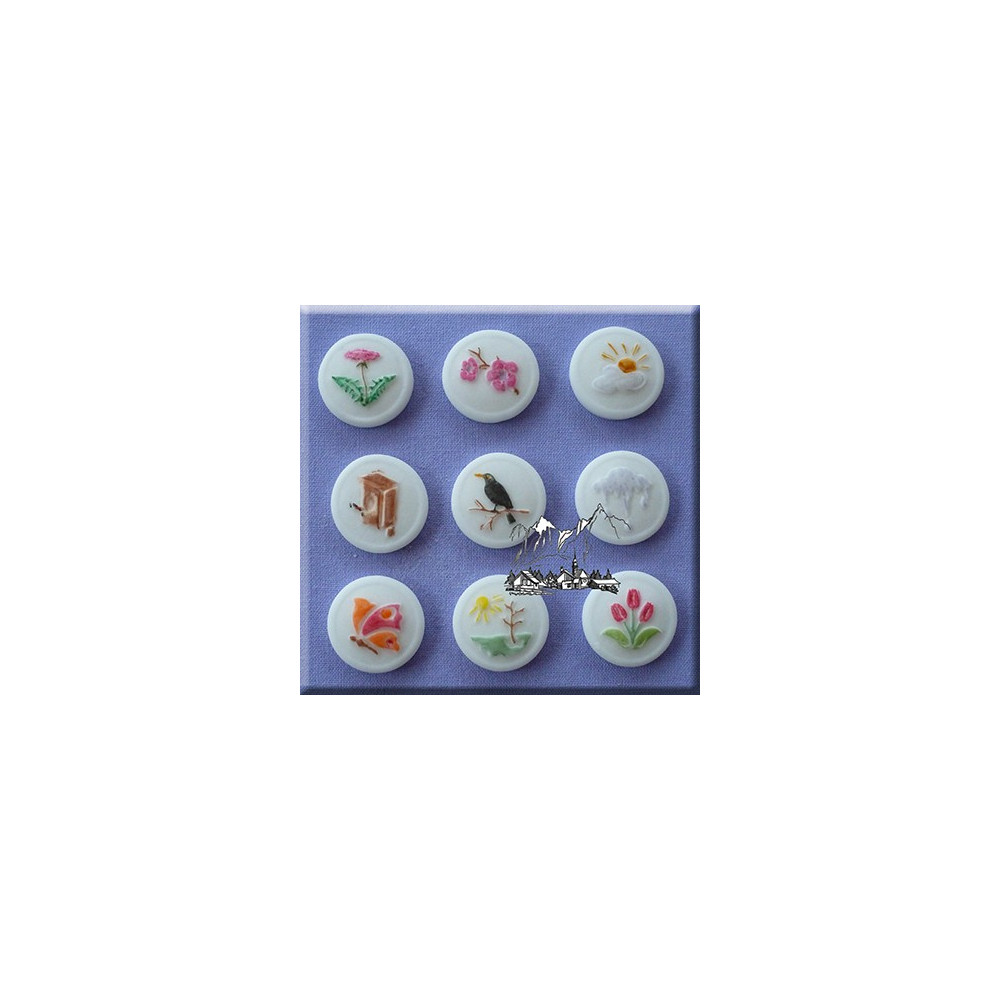 V sadě je 9 knoflíku každý s jiným motivem.