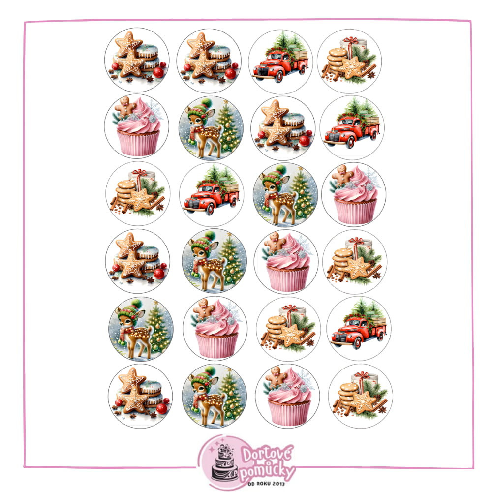 Rozkošné sobíci, perníčky, cupcaky a červené vánoční autíčko s dárky – tahle sada přináší vše, co dělá Vánoce kouzelnými. Motivy jsou ideální na dorty, cupcaky i perníčky a zaručeně vykouzlí úsměv každému, kdo se na ně podívá.