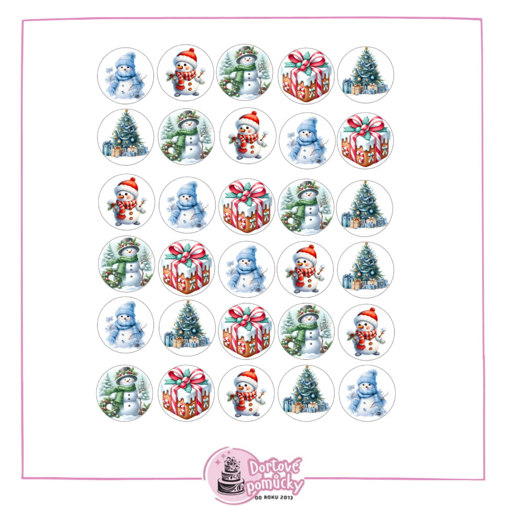 Veselé vánoční motivy sněhuláků, dárků a ozdobených stromečků nabízíme jako jedlý papír nebo fondánový list.