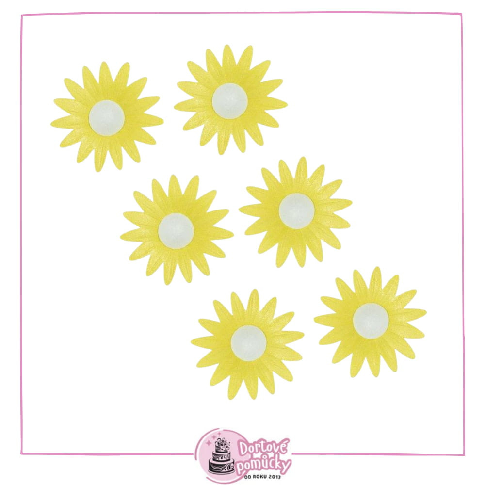 V balení najdete 6 kusů kopretin o průměru 5,5 cm – ideální počet pro zdobení jednoho dortu nebo několika menších dezertů.